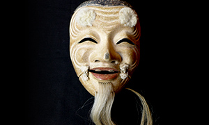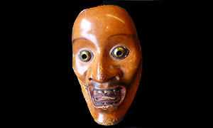 This is an extremely special style among Noh masks and it is the most sanctified. Even though these masks are also “old man” as well as the masks of old man, it is referred to the masks used in “Okina” which in Noh is described as “It is Noh, but it’s not really Noh.” In addition, they were crafted in the oldest period, and their carrying a different style compared to the other Noh masks is also one of their characteristics. Its facial expression is smiley and well-fleshed, the bottom jaw is separated, and it has a plump face with bushy eyebrows. It is said to be the mask that symbolically expresses the celebrational speech. Though there are various opinions about who Okina represents, it is said to be an indigenes god or arts at temples turning into Sarugaku. Sarugaku refers to Gigaku—an ancient musical in which actors perform along with music wearing masks— which was passed on from China, and/or Sanraku—magic, acrobatics, conjuring, dance and so on—that became popularized with various arts, and especially what developed to comedic art or sketch.