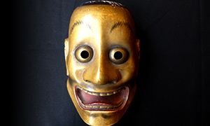 With the mouth open and wide-opened eyes as if they pop out, this is a mask that appears as a god with full-flown dignity. It is fully gold-painted and plated copper is put in the eyes and thus the dignity is emphasized.